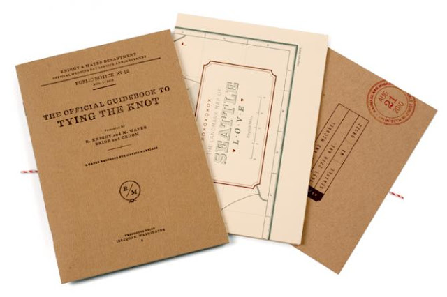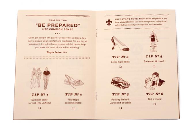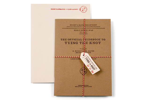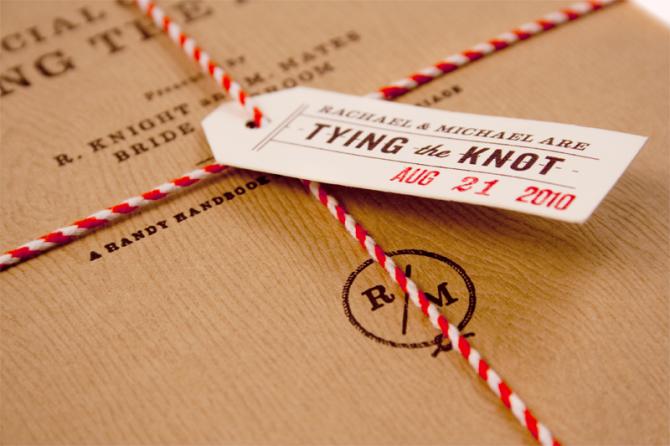 I love anything field guide-esque, and I love brown paper with red and white bakers’ twine, so I immediately fell hard for these “tying the knot” themed wedding invitations. But the cover of the “guidebook to tying the knot” is only the beginning. There’s even more to love inside…