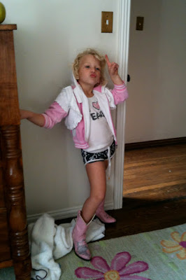 Here, we see the little sweater (over a hoodie) and pink cowgirl boots again, but today she’s feeling a little street, a little sassy, ultra girly, for a sort of overall Dukes of Hazzard (J. Simpson version) meets Bring it On feel.