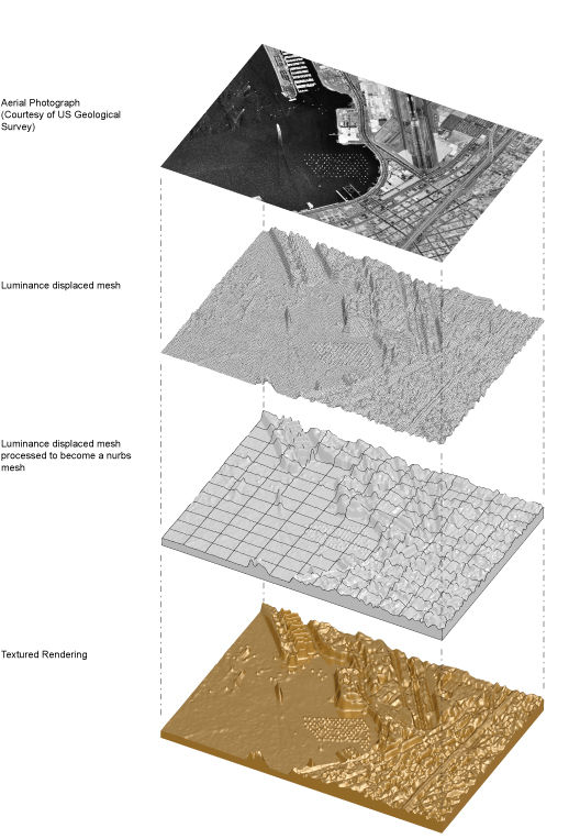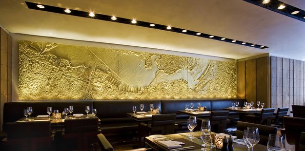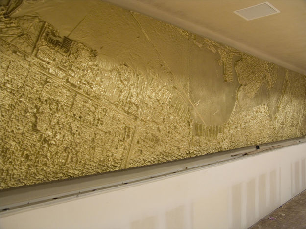 Not content with merely an “artistic representation” of the layout of the city, they created a geographic and topographic replica using custom-made software to transform an aerial photo in a 3-d bas relief using wood, bronze, and polymer resin.