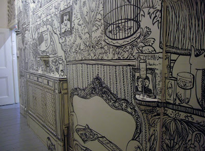 Charlotte Mann gives a new meaning to “mural,” as well as to “pen and ink drawing.” She takes her pen and ink directly to the wall, and makes a mural not depicting some unrelated subject matter, but rather, an imaginary version of what the wall could look like, or what the rest of the room could look like were there not a wall right there.