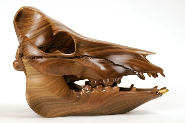 The piece at top is from the series “Food,” with the top piece titled “Pig,” and the following pieces are various breeds of dogs, from the series “Man’s Best Friend.”  Roth hand carves these pieces herself, out of walnut, vera wood, or acrylic, and embellishes them with gold leaf and Swarovski crystals.