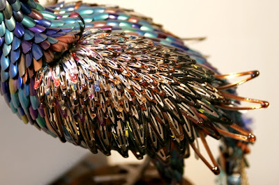 Below, two pieces from her “Peacocks” series, made of fake nails, hair clips, fake eyelashes, and dime store jewelry.