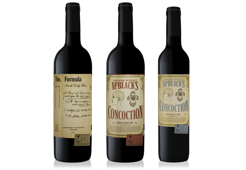 For the wine above, MASH created the concept based on the identity of the man behind the Small Gully wines, a Mr. Stephen Black, who formerly was a chemist who worked in pharmaceuticals. So MASH ran with the chemist thing, calling the wine “Mr. Black’s Concoction” and designing a retro apothecary-ish feeling label.