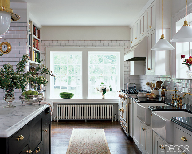 This photo above always gets me, I like pretty much every element… the color-coordinated cookbooks + hanging pots and pans + white subway tile + high-contrast countertop + brass drawer hardware.