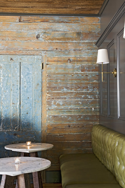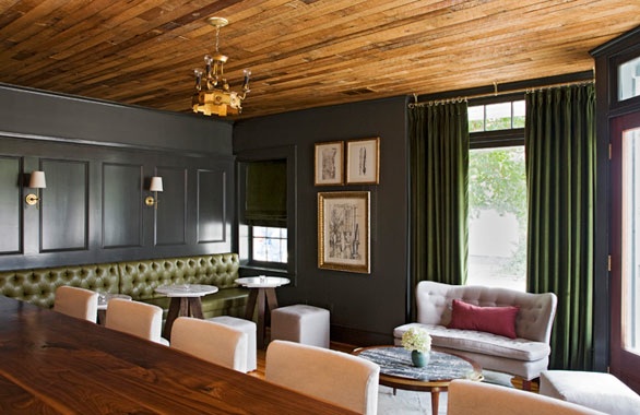 Loving the looks of this new wine bar, Enoteca, designed by Angie Hranowsky. The mix of rustic wood with the rich grey paneled walls, button-tufted banquette, luxurious curtains, and gold accents makes for an incredibly visually interesting environment. I wouldn’t mind having a glass or two here when the light gets low, would you?