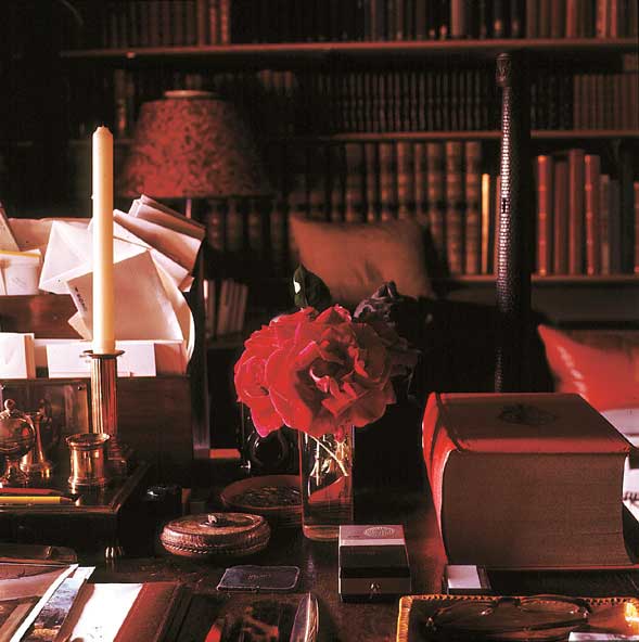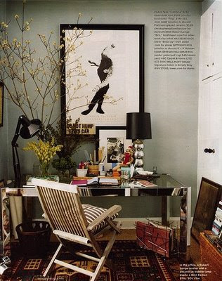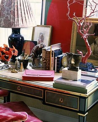 In all three, note the use of books, plants (fresh flowers, architectural branch arrangements, etc), lighting (the top piece uses two lamps to great effect– not an obvious idea though), art, and actual desk necessities (writing utensils, paper goods, and organizational things) made to look appealing.