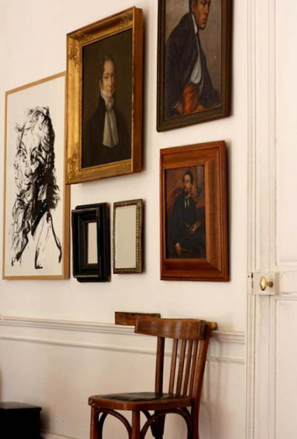 The arrangement of such items is also key– the books are both stacked and upright, objects are grouped together, art is both hung and propped, pieces are layered in front of and behind each other…