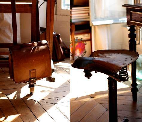 (here’s a better shot of the map– it’s an old plan of Paris), salvaged industrial lighting and seating (see welder’s stool below, science lab lamp above, heat lamp below)…