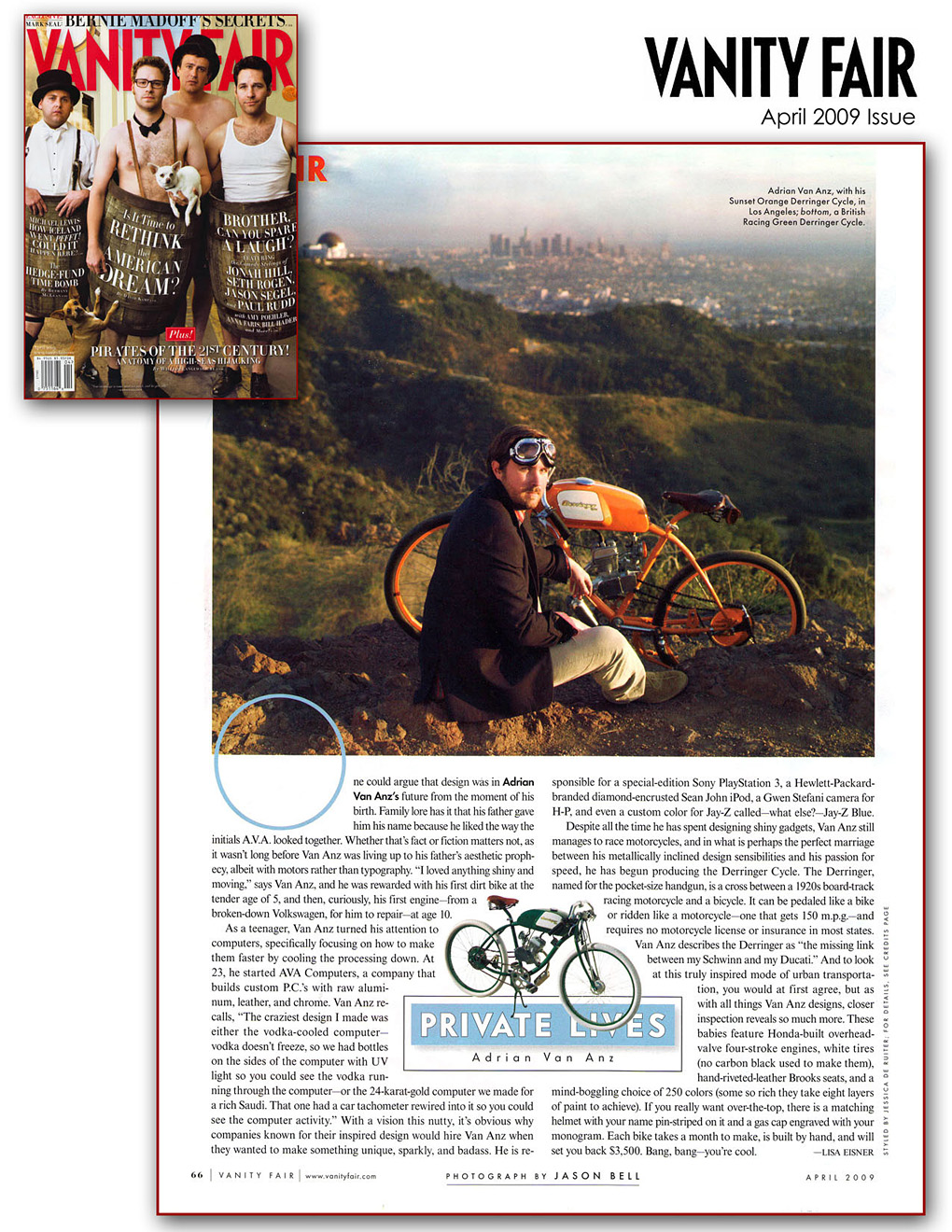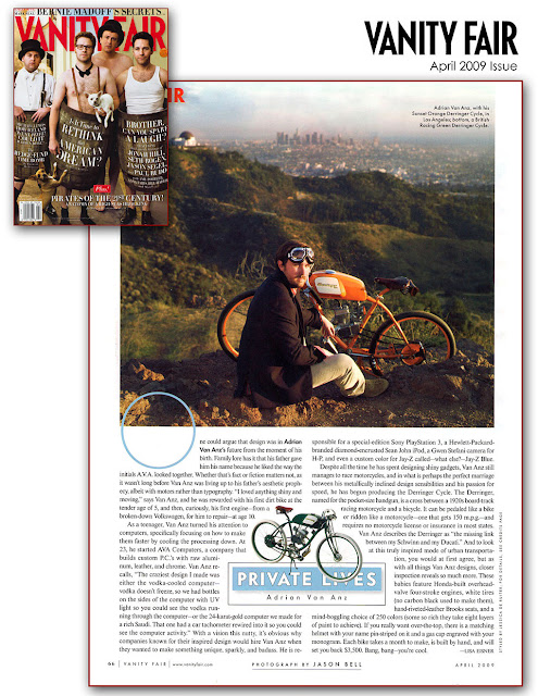 From famed industrial designer Adrian Van Anz, who also makes custom computers featuring chrome, deer hide, and raw aluminum, comes the Derringer– a cross between a 1920s-style board track motorcycle and a bike. A designy, eco-conscious commuters dream.