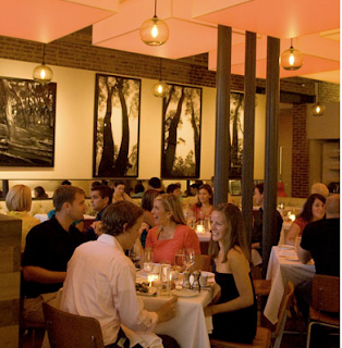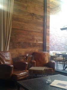 Ok, back to Gjelina. LOVED: the wood planking on the ceiling, the brick floor inside, the big light fixture with all different shapes and sizes of Edison bulbs, the paint color (dark grey but with brown in it, and very matte, like a chalkbooard), the light mint green industrial stools, and the different sized glass-front cabinets that make up the bar-back.