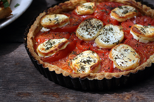 Summer Lovin >> Tomatoes. Tomatoes in a tart shell with herbs and goat cheese.