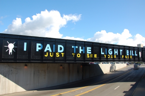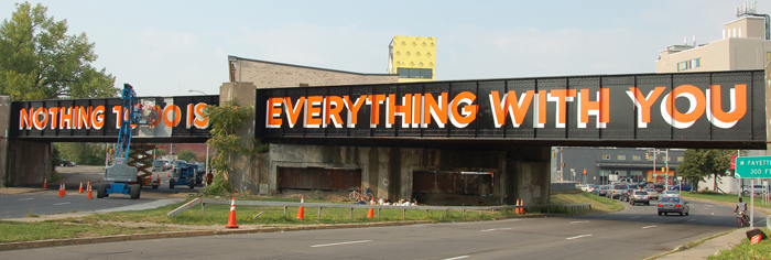 Powers, together with these organizations, used painted phrases to turn three train bridges that are physical and metaphorical dividers between two very disparate neighborhoods into points of unity and conversation-starters.