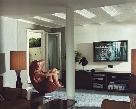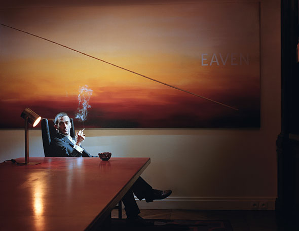 Click through for shots from his current Paris apartment. Apparently after the personal-image transformation he also went on an absolute contemporary-art-buying bender, as his previous apartment had almost none and his current apartment his practically overflowing with Ruschas, Currins, etc.