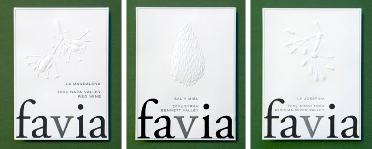 Favia, incidentally one of my favorite wines, uses blind embossing for the images used on the different labels so that the very simple, bold word is what always pops.