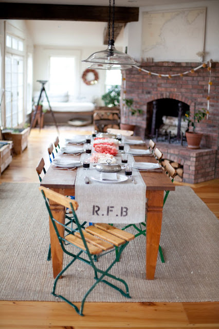 [photo above: This is where we eat! We wanted to be able to eat dinner  next to the fire. It's open to the kitchen since that is where we spend  most of our time. The table and chairs are from our collecting  excursions. It sits 10-12 people comfortably.  We have those fold up  chairs all over the house! if you want to have a party in the grass you  can bring them outside! The chairs get around.]
