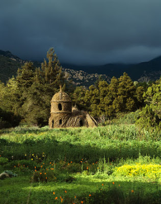 To me, he rather seems like the Frank Gehry of primitive architecture. Gehry looked at buildings made of modern materials and asked why they could be more imaginitive and fluid, while Dougherty essentially did the same thing with the most basic building materials.